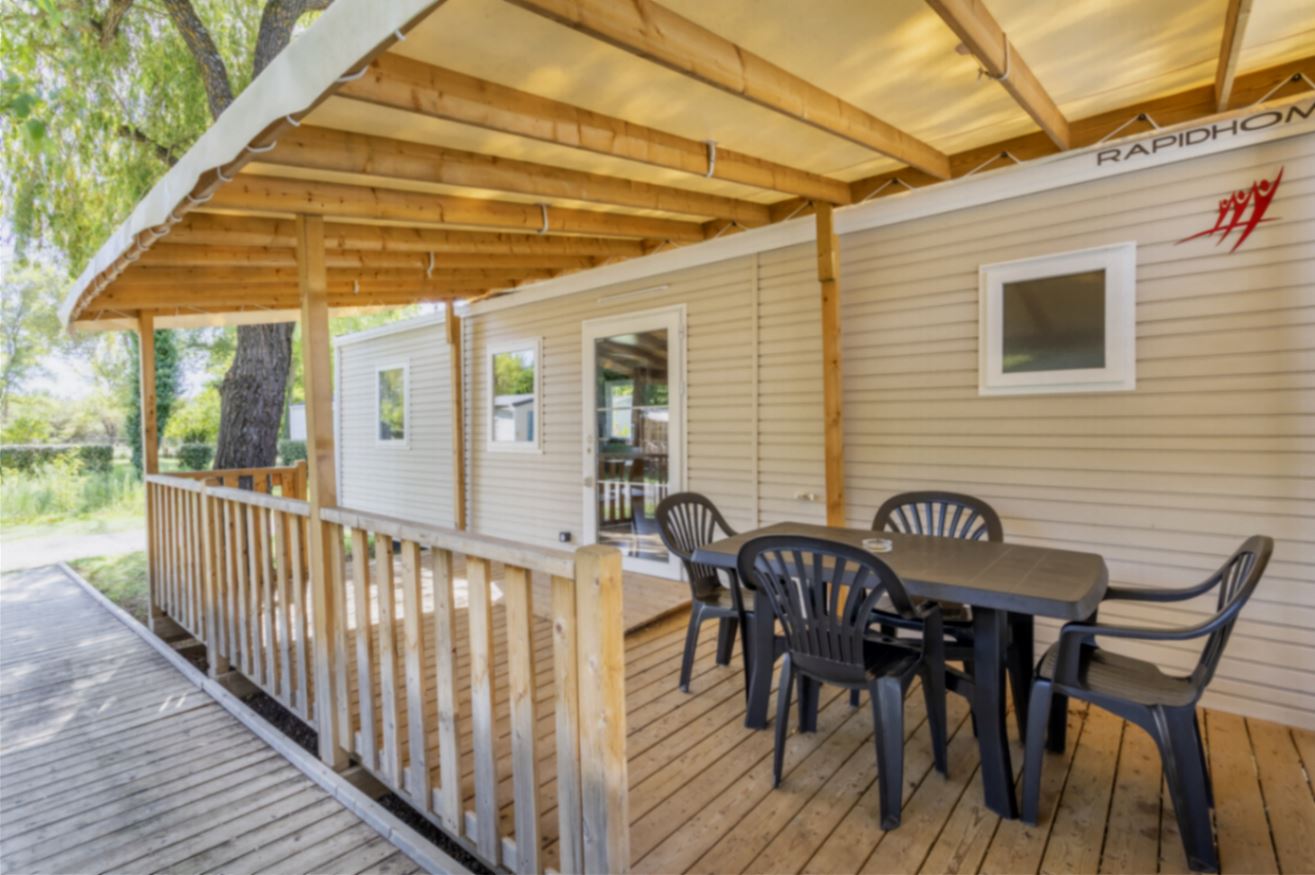 Extérieur : terrasse en bois couverte avec salon de jardin.