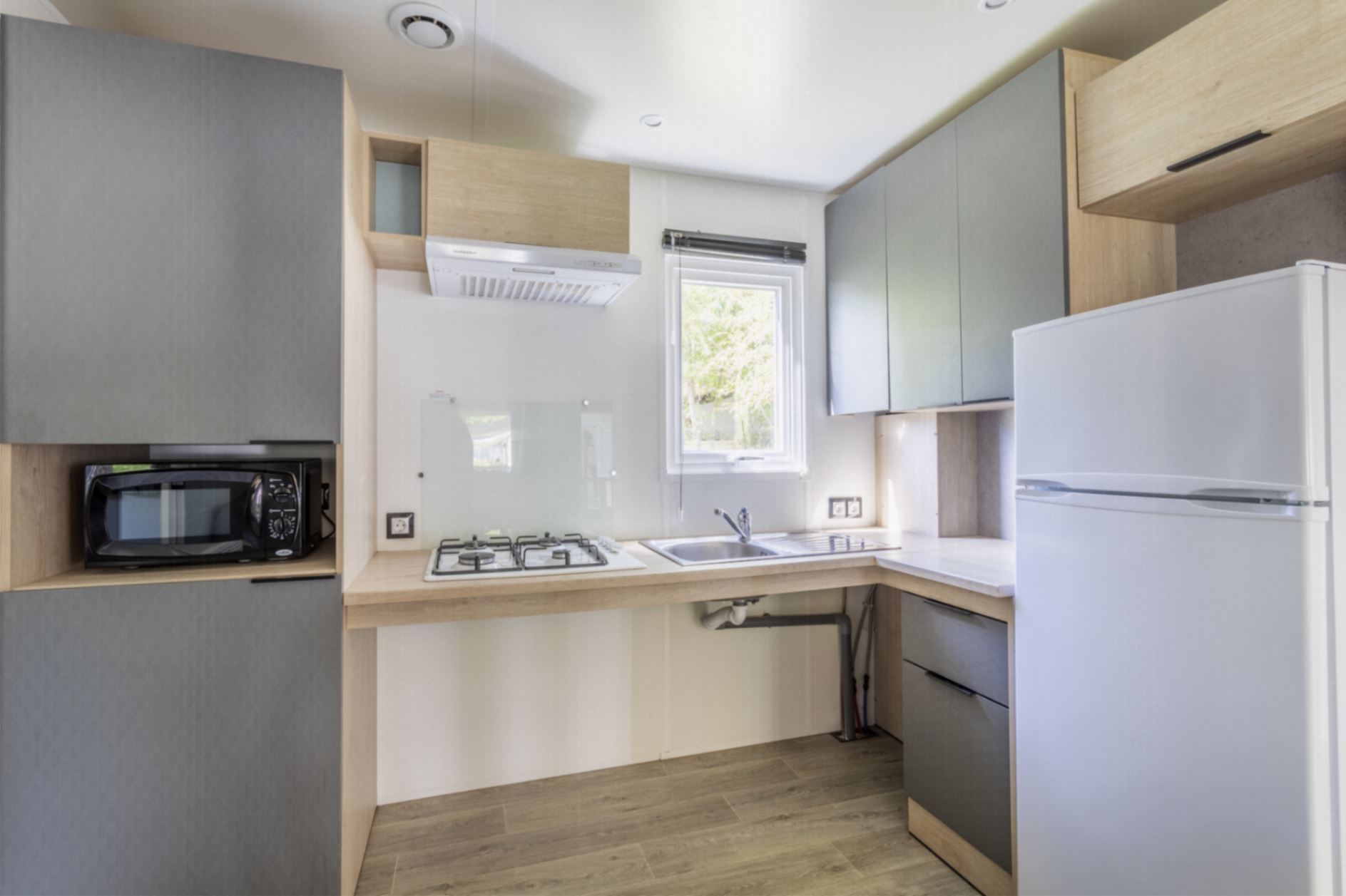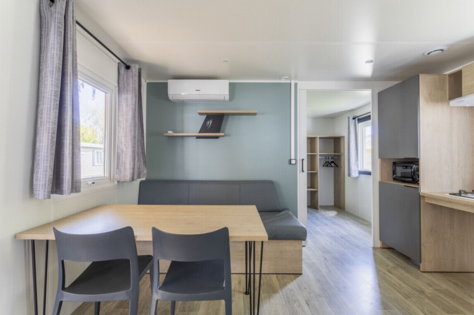 Coin cuisine/séjour : cuisine équipée : évier, gazinière à 4 feux, réfrigérateur – congélateur, micro-ondes, cafetière à filtre, vaisselle, chauffage dans le séjour et climatisation.
