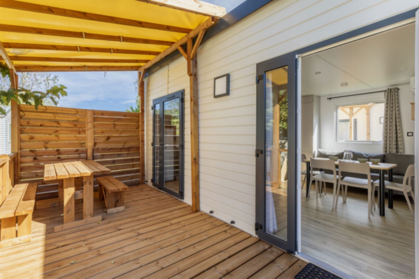 Extérieur : terrasse en bois semi-couverte avec salon de jardin.