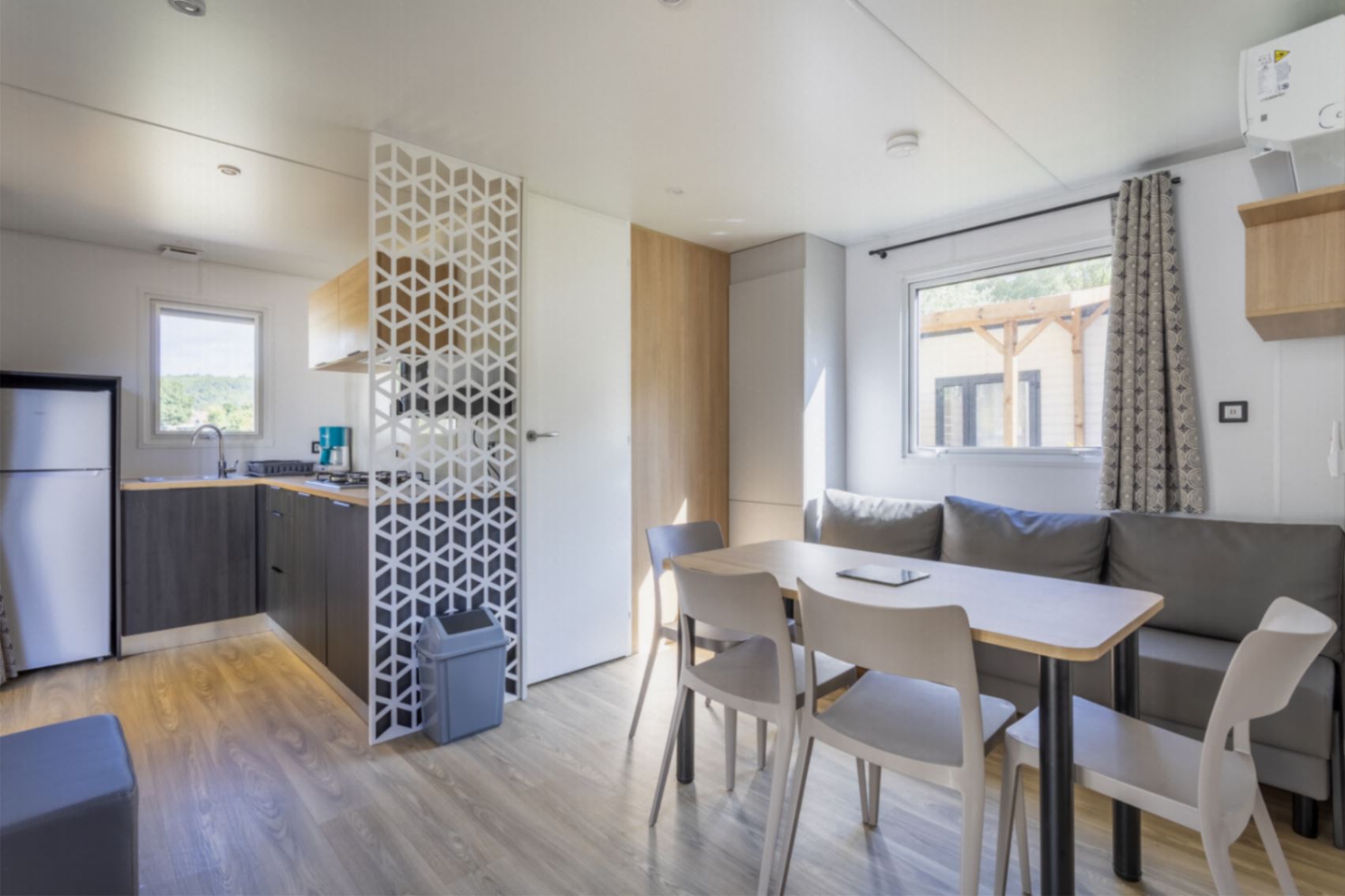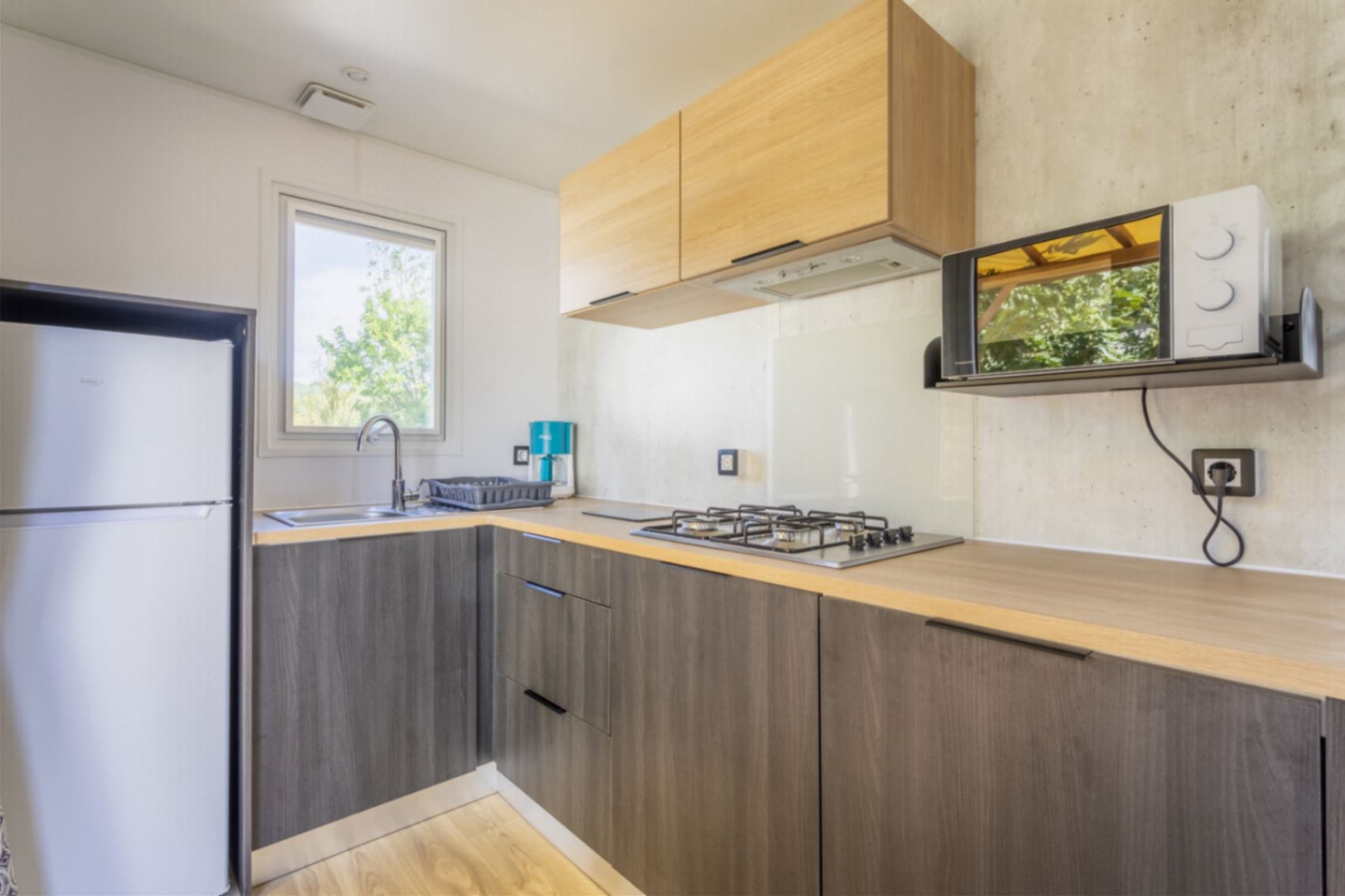 Coin cuisine/séjour : cuisine équipée : évier, gazinière à feux, réfrigérateur – congélateur, micro-ondes, cafetière à filtre, vaisselle, lave-vaisselle et climatisation réversible.